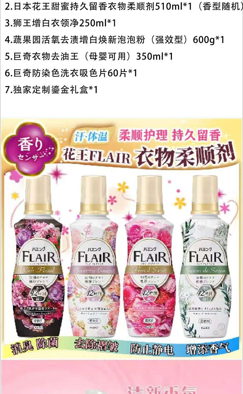1.日本花王持久留香玫瑰洗衣液690ml *1(香型隨機(jī)) 2.日本花王甜蜜持久留香衣物柔順劑510ml*1(香型隨機(jī)) 3.獅王增白衣領(lǐng)凈250ml*1 4.蔬果園活氧去漬增白煥新泡泡粉(強(qiáng)效型)600g*1 5.巨奇衣物去油王(母嬰可用)350ml*1 6.巨奇防染色洗衣吸色片60片*1 7.定制鎏金禮盒*1